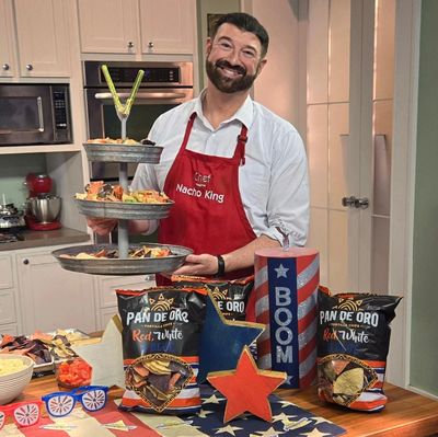 I like to serve this one on a three tiered stand for display using red, white and blue Pan De Oro tortilla chips